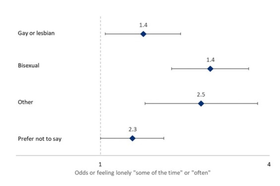 The risk of experiencing loneliness was greater for gay, lesbian and bisexual people, as well people who selected ‘other’ to heterosexuals.