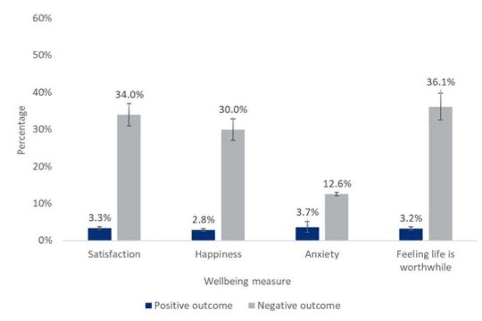 For this analysis, respondents are considered to have positive outcomes in the areas of life satisfaction, happiness and feeling that life is worthwhile if they responded 5 or higher to each of these questions. This approach was reversed for the anxiety scale, with respondents who selected a score of 5 or lower considered to have a positive outcome in this wellbeing area, due to the focus of this question being on negative experiences.