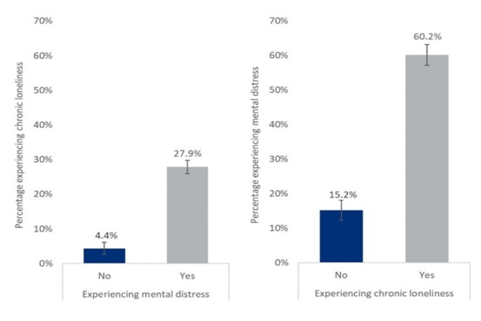 Two bar charts showing that people experiencing mental distress were five times as likely to experience loneliness than people without, and people experiencing loneliness were four times as likely to experience mental distress than non lonely people.