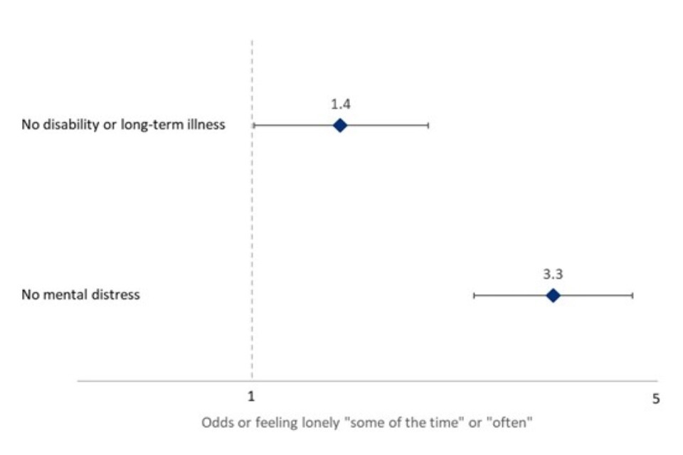 Odds ratio plot showing people without a disability were 1.4 times more likely to stop feeling lonely compared to disabled people, while people without mental distress were 3.3 times more likely to stop feeling lonely than those with mental distress.