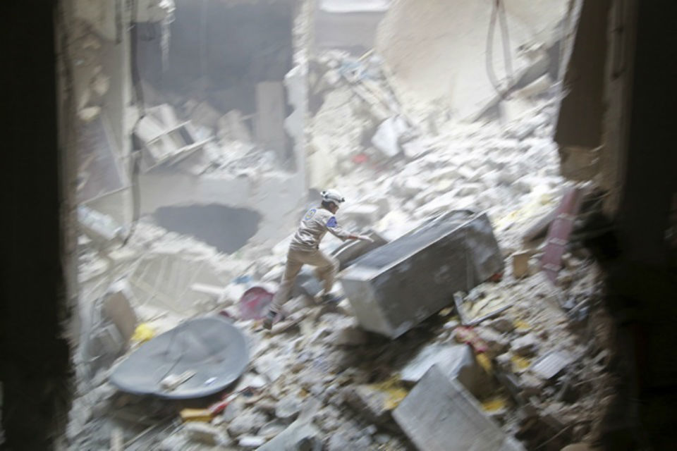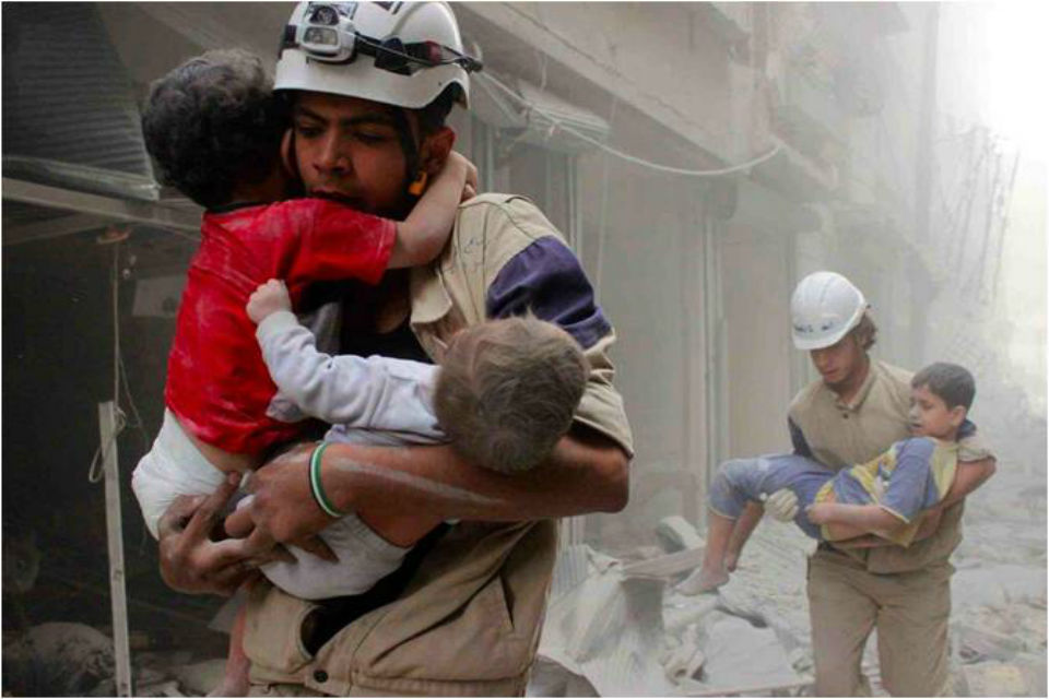 Civil defenders rescuing children following a bomb dropped by the Assad regime in July 2015.