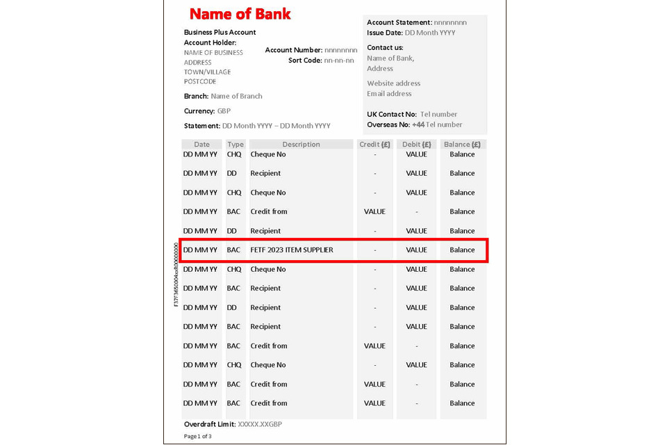 You will need to send us copies of your business bank, building society or business credit card statement so we can check all invoices have been paid in full by the business named in the GFA. For cheque or BACS payments, the cheque number or transfer reference should be shown on the statement. Acceptable evidence includes screenshots from an online account showing payment details and bank or building society logos, or a certified report printed from a banking system.