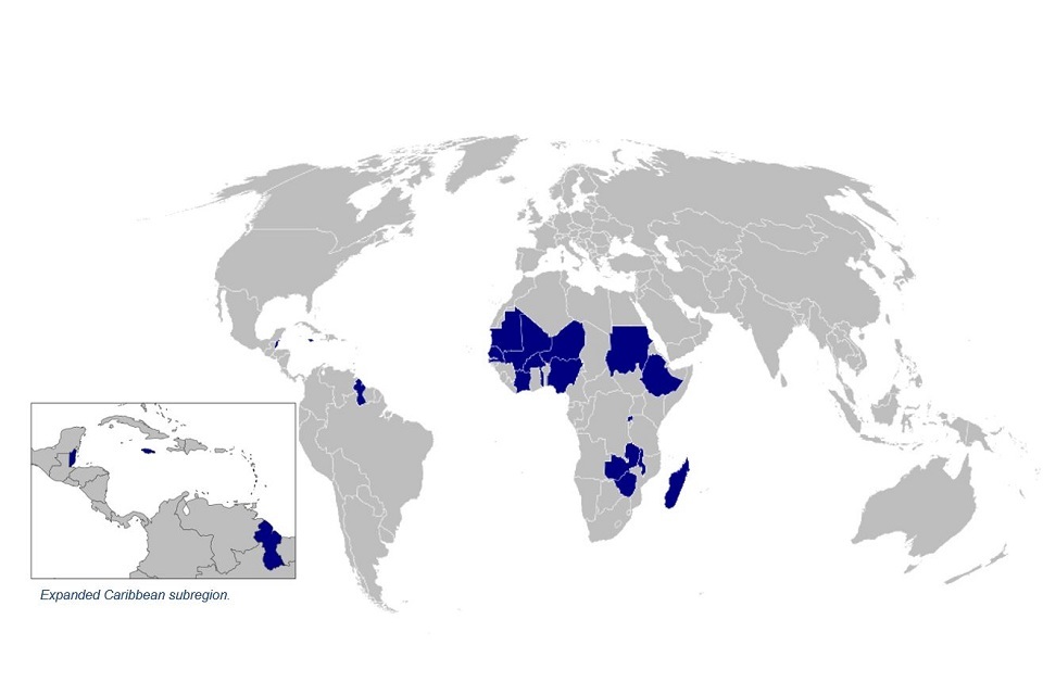 Figure 3: The geographical spread of evaluation products in the 2023 to 2024 financial year, the focus box on the left highlights the Caribbean subregion.