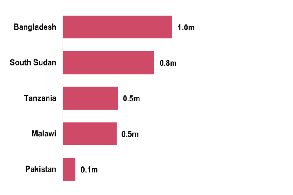 Data in chart – Bangladesh: 1 million, South Sudan: 0.8 million, Tanzania: 0.5 million, Malawi: 0.5 million, Pakistan: 0.1 million.