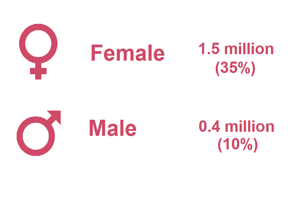 Data in graphic - Female: 1.5 million (35%), Male: 0.4 million (10%)