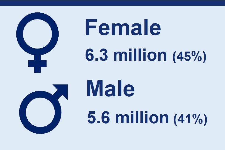Data in chart: female: 6.3 million (45%), male: 5.6 million (41%).