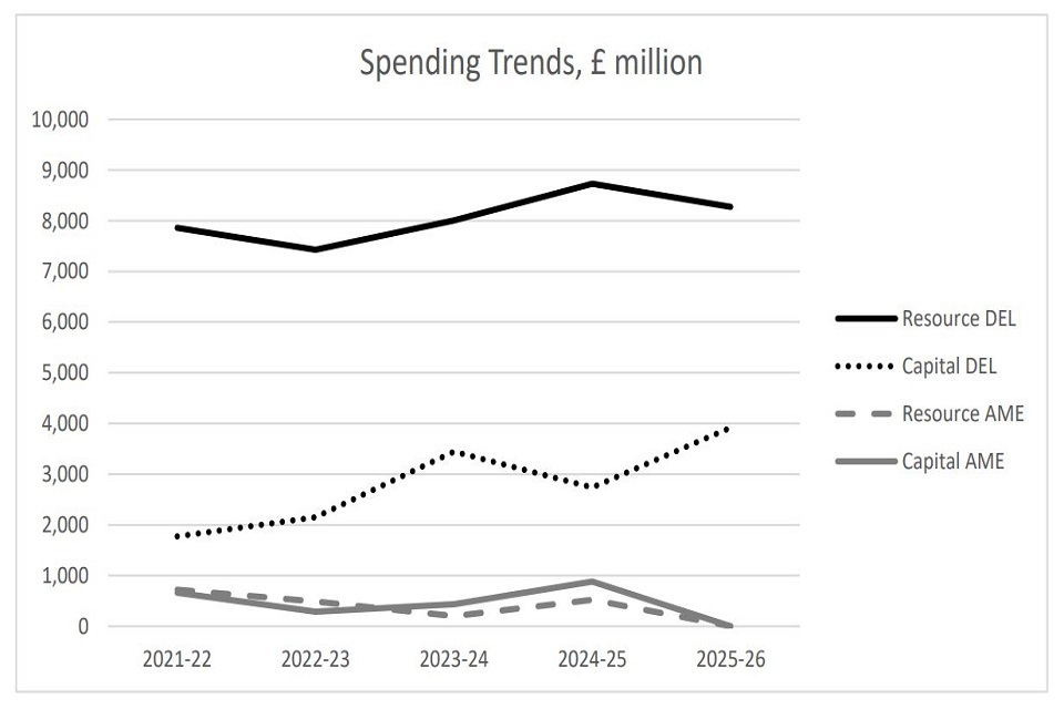 In comparison to the Mains Estimate 2024 to 2025, there is a net increase in Resource DEL of £557 million (7%), reduction in Capital DEL of £22 million (1%) and increase in Capital AME of £461 million (110%).
