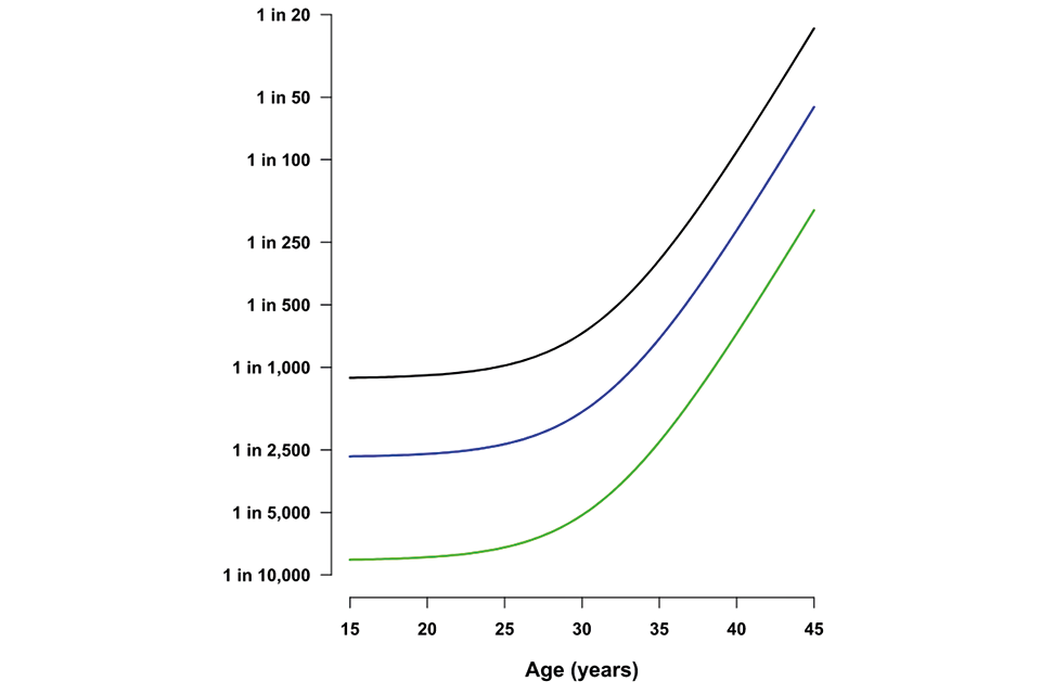 Graph illustrating the chance of a pregnancy being affected by Down’s syndrome, Edwards' syndrome or Patau’s syndrome (y axis) according to maternal age (y axis). The graph shows the risk of all 3 conditions rising steeply after the age of 30