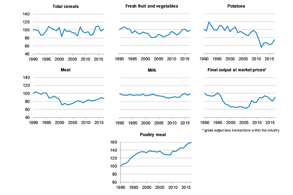 Final output3 of UK agriculture is a proxy for UK food production. The volume of all outputs rose by 12% between 2016 and 20174.