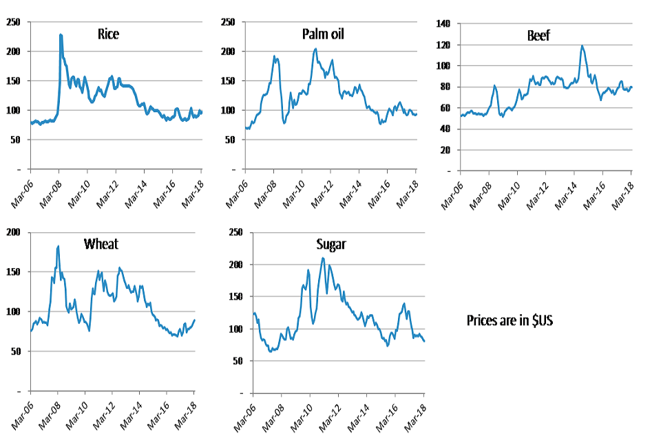 Sugar prices have varied, but peaked in 2010/11, while palm oil and wheat prices have fluctuated over the period.