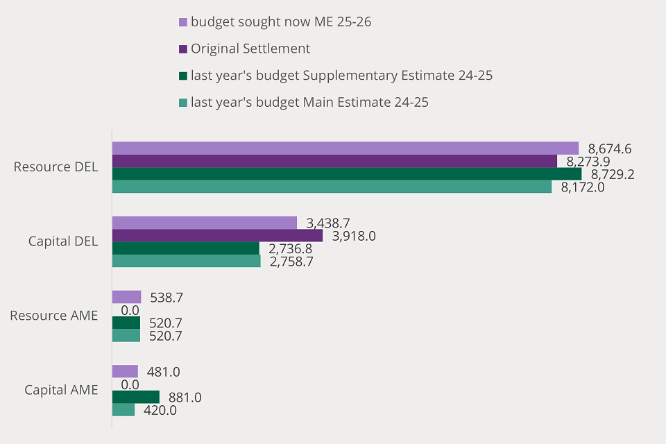 | Amounts sought this year £m (Main Estimate 2025 to 2026) | Difference £m (+/-) compared to final budget last year (Supplementary Estimate 2024 to 2025) | Difference % (+/-) compared to final budget last year (Supplementary Estimate 2024 to 2025) | Difference £m (+/-) compared to original budget last year (Main Estimate 2024 to 2025) | Difference % (+/-) compared to original budget last year (Main Estimate 2024 to 2025) | Difference £m (+/-) compared to Spending Review: AB 2024 | Difference % (+/-) compared to Spending Review: AB 2024 | |