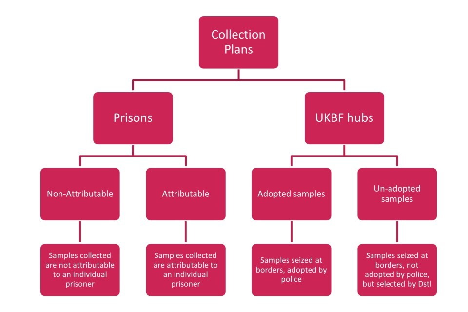 The collection of 500 non-attributable samples was arranged, collected from 4 prisons. FSPs shared data relating to 600 attributable samples with Dstl. The attributable samples were collected from at least 43 prisons across the UK.