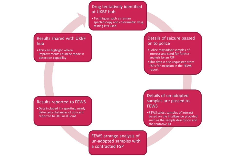 The aim of the Forensic Early Warning System (FEWS) is to examine trends in the seizures of NPS in the UK including prisons and border locations and to identify if any new substances emerge in the recreational drug market. This activity is carried out for the Home Office Drugs Misuse and Firearms Unit (DMFU). Figure 1 provides an overview of the activities conducted by the FEWS project.