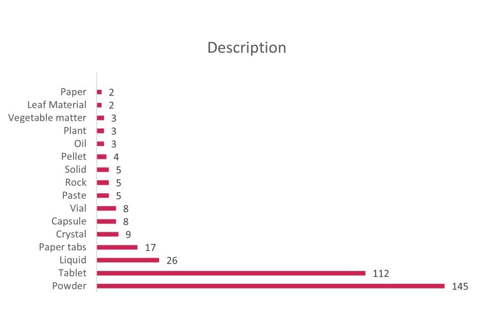 The physical descriptions of the samples collected are shown in Figure 4. The majority of samples were tablets and powders.