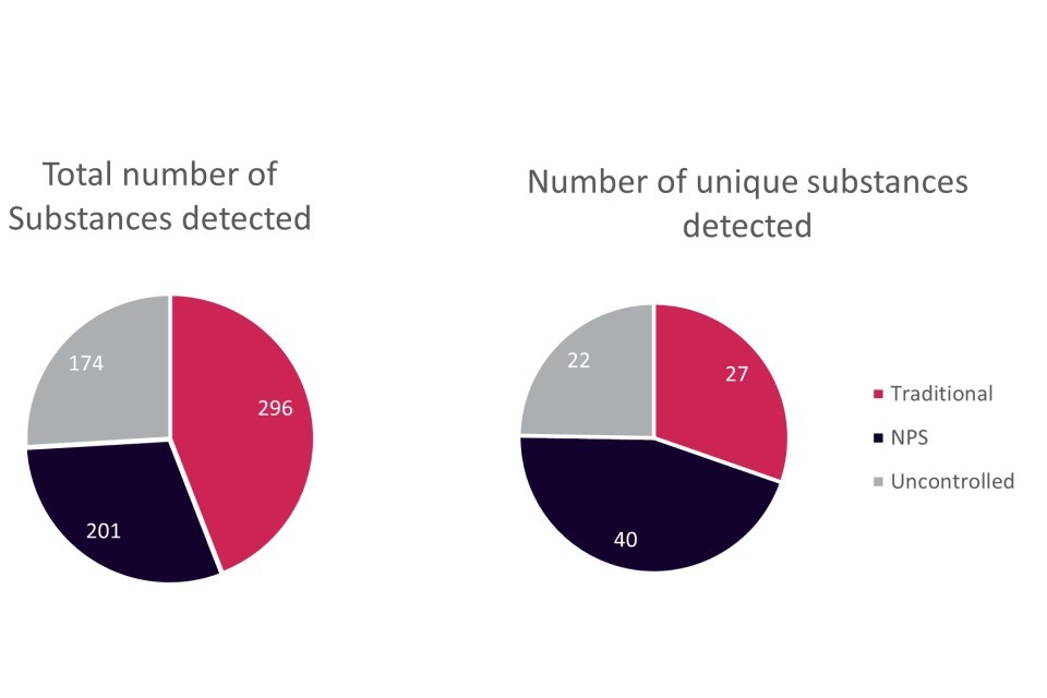 In FY 2021 to 2022, FEWS collated data from samples of suspected NPS from UK Border Force (UKBF) locations and UK prisons. From prisons, 500 non-attributable samples and 600 attributable samples (data) were collected. 70 of the non-attributable samples collected were non-drug items and were not analysed. No drugs were detected in 153 of the 500 samples analysed. Of the remaining samples, 349 substances were detected comprising of 47 unique substances. It was reported that no drugs were detected in 87 of the attributable samples. 609 substances were detected in the remaining 513 samples comprising of 80 unique substances.