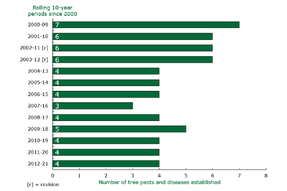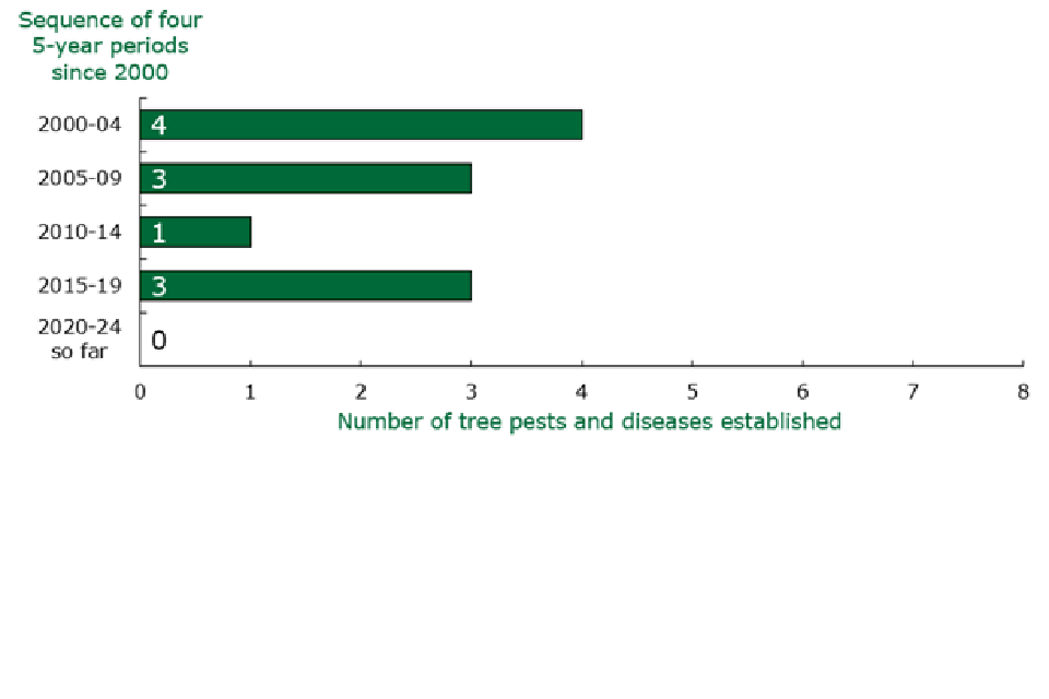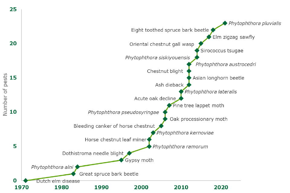 Emergence of new pests and diseases since 1970, showing sharp increase in newly established pests and diseases since 2000.