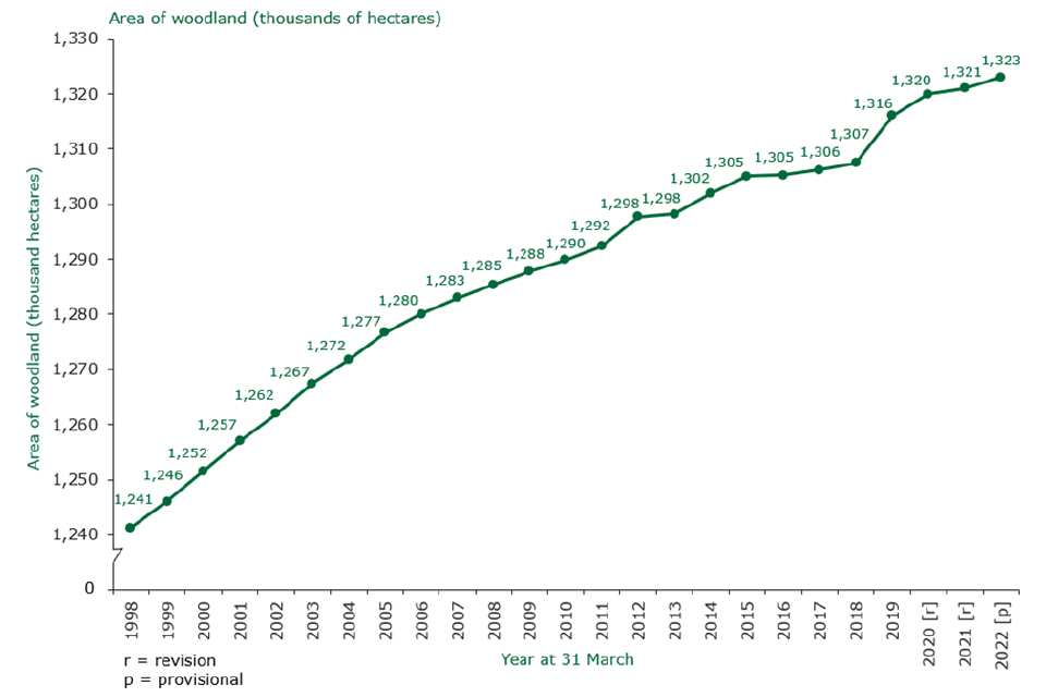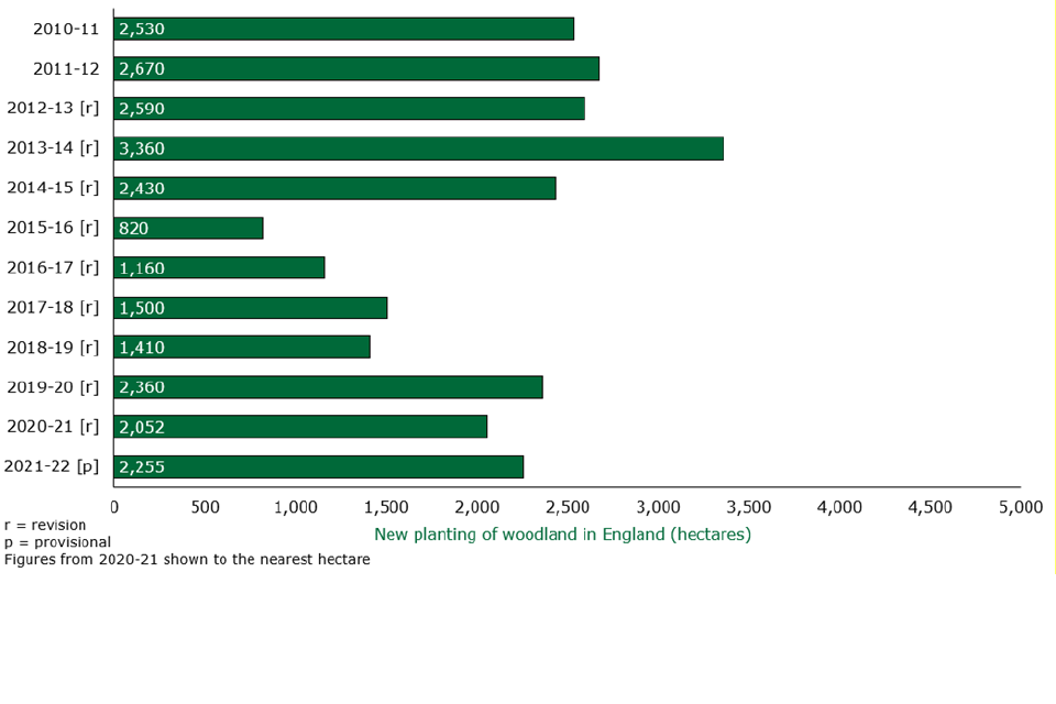 EWCO opened in June 2021 and received over 370 applications by the end of 2021-22. The grant agreements offered in that time will see 1,085 hectares of new woodland created, with a further 1,300 hectares in progress. There are partnerships, such as community forests, which help deliver government funded tree planting with the Forestry Commission continuing to regulate the planting.