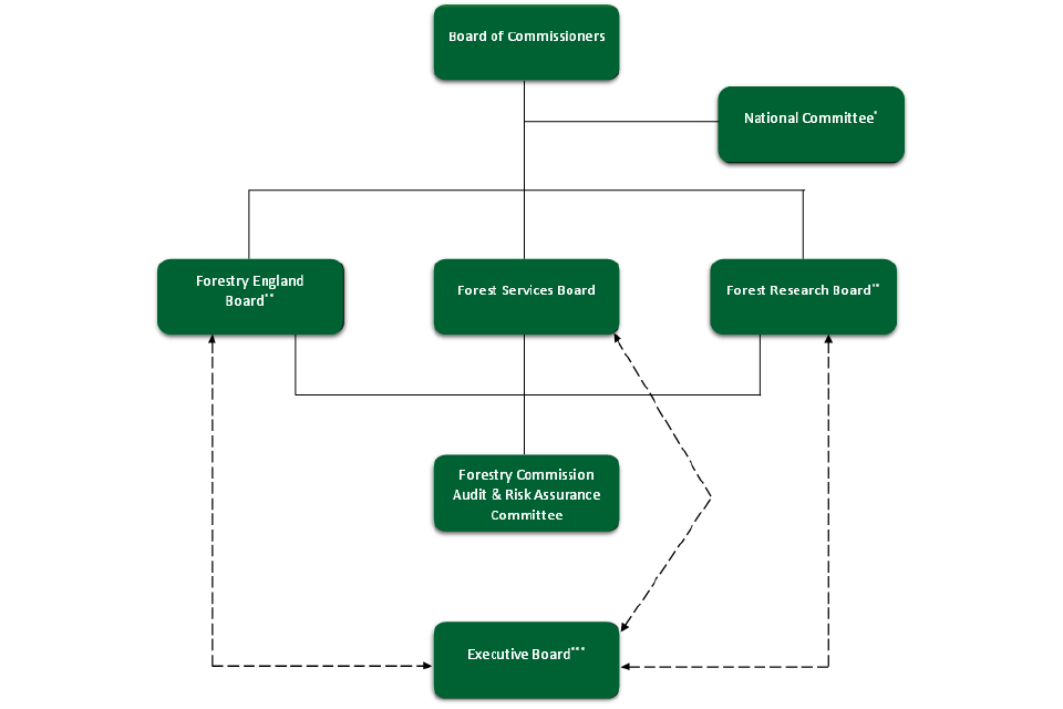 The Board of Forestry Commissioners provides a collective overview to the Forestry Commission and its agencies. Each agency, as well as Forest Services, has established its own Board comprised of Commissioners, non-executive directors and executive staff of the respective organisations. These individual Boards make decisions specific to each organisation. These are underpinned by the Forestry Commission Executive Board which is a Forestry Commission group of executive members championing forestry that meets to provide direction for collective decisions and sharing of knowledge and policy.