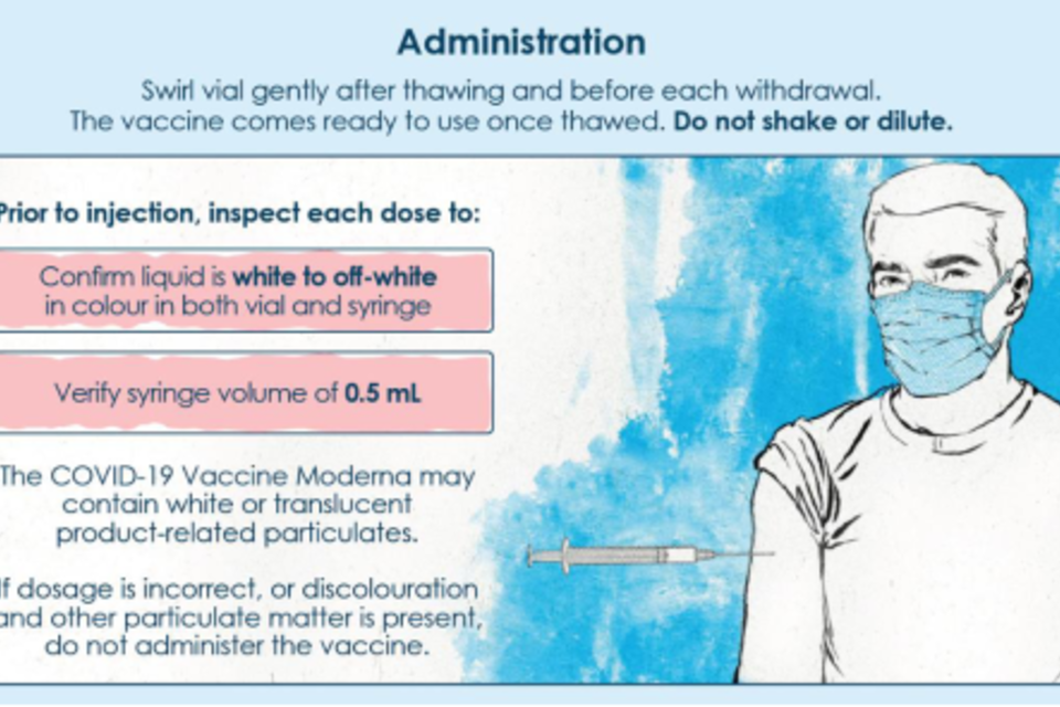 Visual inspection is performed by the manufacturer on finished product vials as part of the release testing of Moderna vaccine. In addition, the SmPC contains the following instructions to the Healthcare Professional ‘If dosage is incorrect, or discolouration and other particulate matter is present, do not administer the vaccine’.