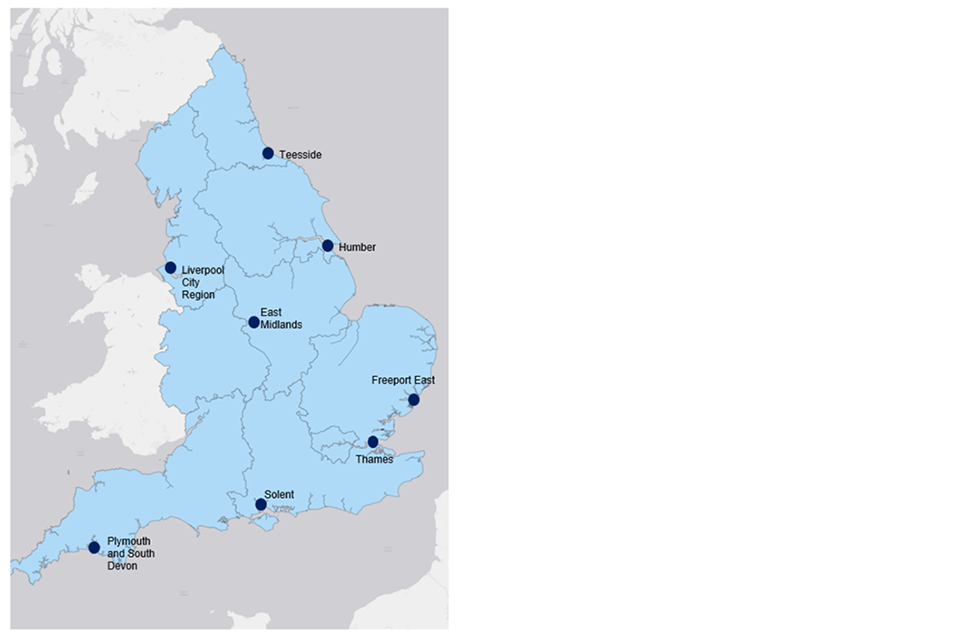 Map of England highlighting the locations of the 8 English Freeports, as detailed above