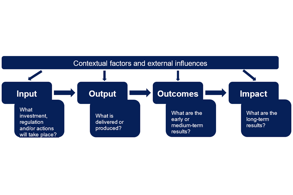 Diagram Outline of process developing a Theory of Change from Input to Output to Outcome to Impact