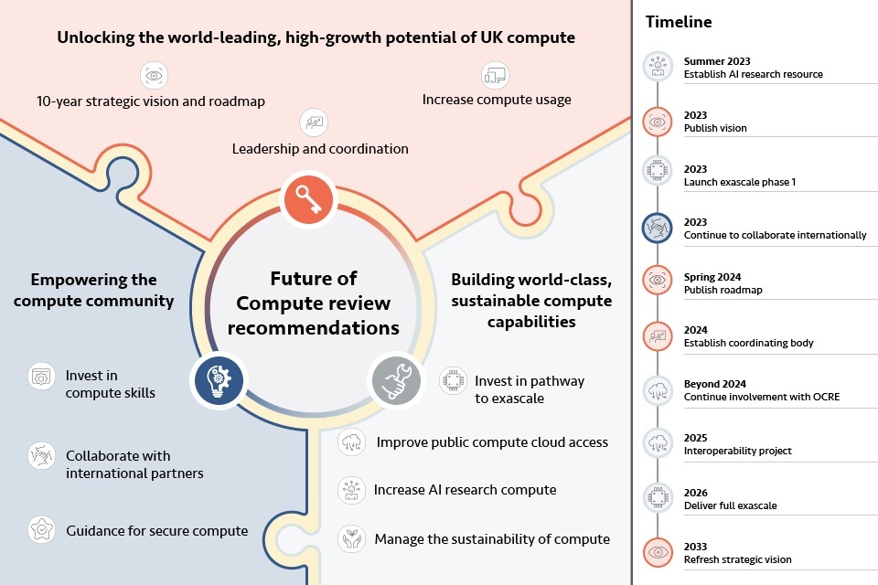 Recommendations sets out the review’s actions for the government. These outline the need for the government to be ambitious and visionary in its approach to compute, the tangible actions required to bolster the UK’s compute infrastructure and the specific measures that will maximise the value of the UK’s compute ecosystem through empowering the community.