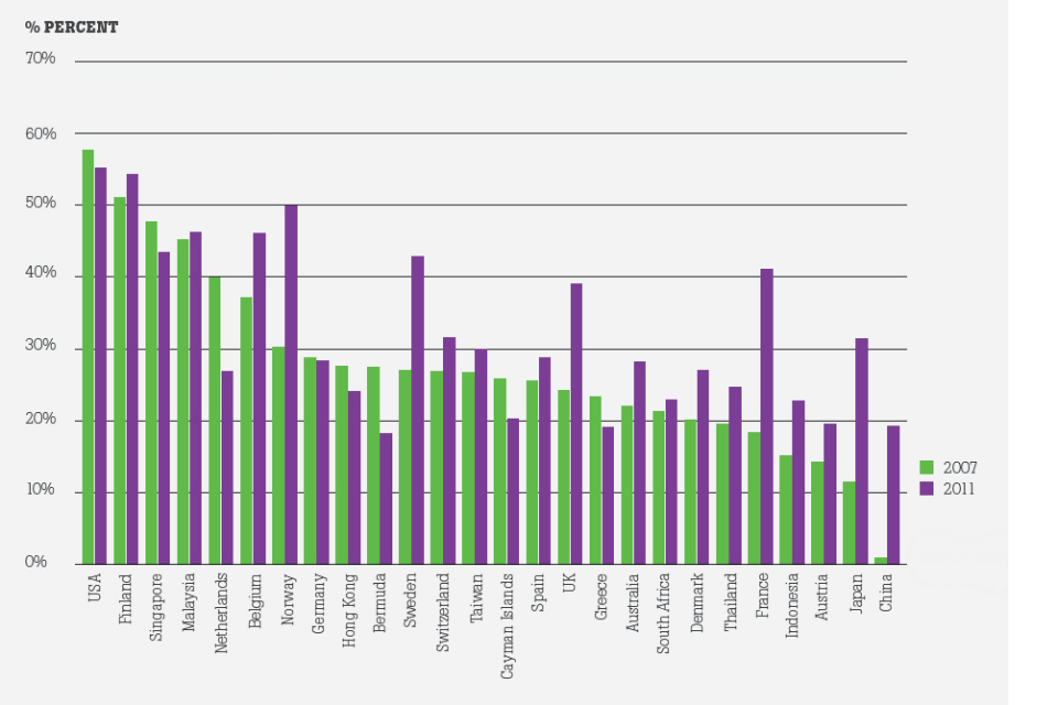 Manufacturers are increasingly using this wider value chain to generate new and additional revenue, with production playing a central role in allowing other value creating activities to occur. For example, 39% of UK manufacturers with more than 100 employees derived value from services related to their products in 2011, compared with 24% in 2007 (Figure 3). This typically involves supporting or complementing products, and offering outcome or availability based contracts for products. Not all manufacturing firms report service revenue separately, and there is no requirement for them to do so. However, in 2009 Rolls Royce reported 49% of its revenue from services, and Arcelor Mittal reported 29%.