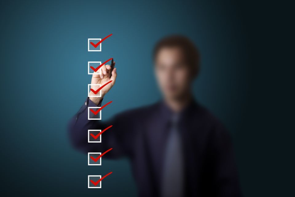 Blurred image of a man facing the camera as he ticks a vertical row of boxes