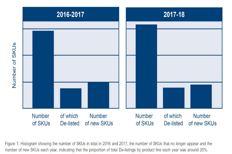 Histogram showing the number of SKUs in total in 2016 and 2017, the number of SKUs that no longer appear and the number of new SKUs each year, indicating that the proportion of total De-listings by product line each year was around 25%.