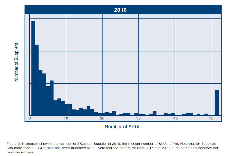 Histogram showing number of SKUs per Supplier in 2016; the median of SKUs is five. Note that for Suppliers with more than 50 SKUs data has been truncated to 50. The pattern for both 2017 and 2018 is the same and therefore not reproduced here.