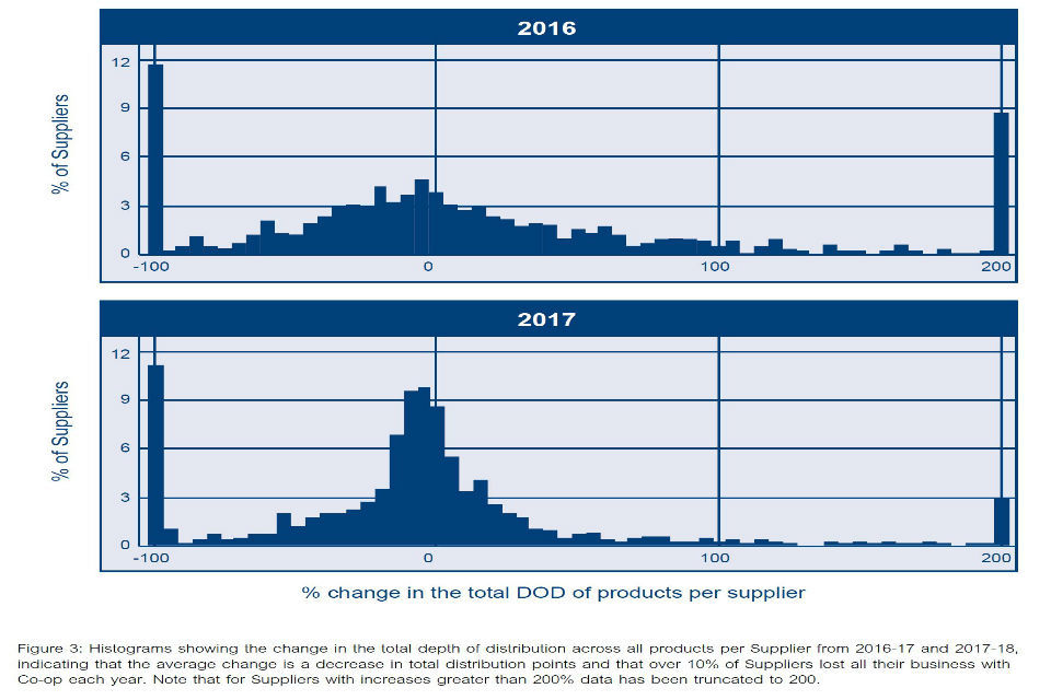 Histograms showing change in the total depth of distribution across all products per Supplier from 2016-17 and 2017-18. The average change is a decrease in total distribution points. Over 10% of Suppliers lost all their business with Co-op each year.