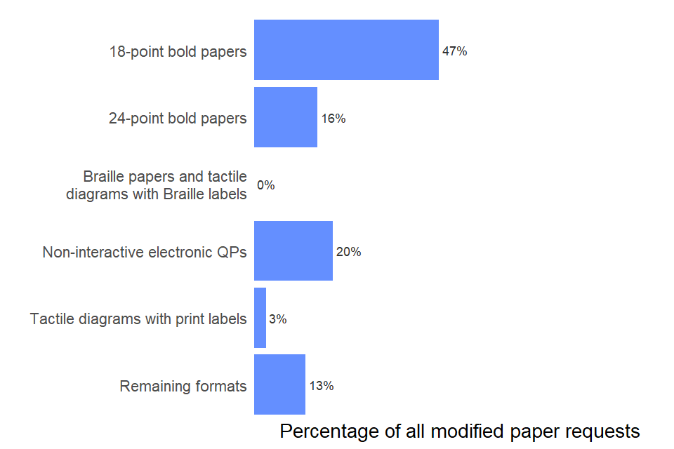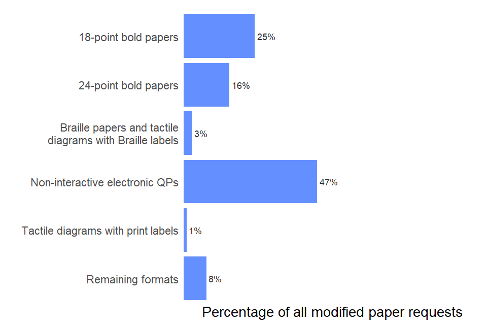 Requests for modified question papers (QPs) are made by schools and colleges in advance of a specific exam series. Modified papers are prepared for candidates with, for example, a range of visual impairments and/or significant language comprehension disorders in order to allow them to demonstrate their skills, knowledge and understanding.