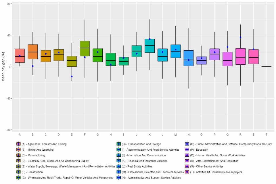 n = 10,533, Blue dots illustrate the cross-industry comparisons drawn from ASHE data. Note that data for sector (T) is not available in the ASHE sample.