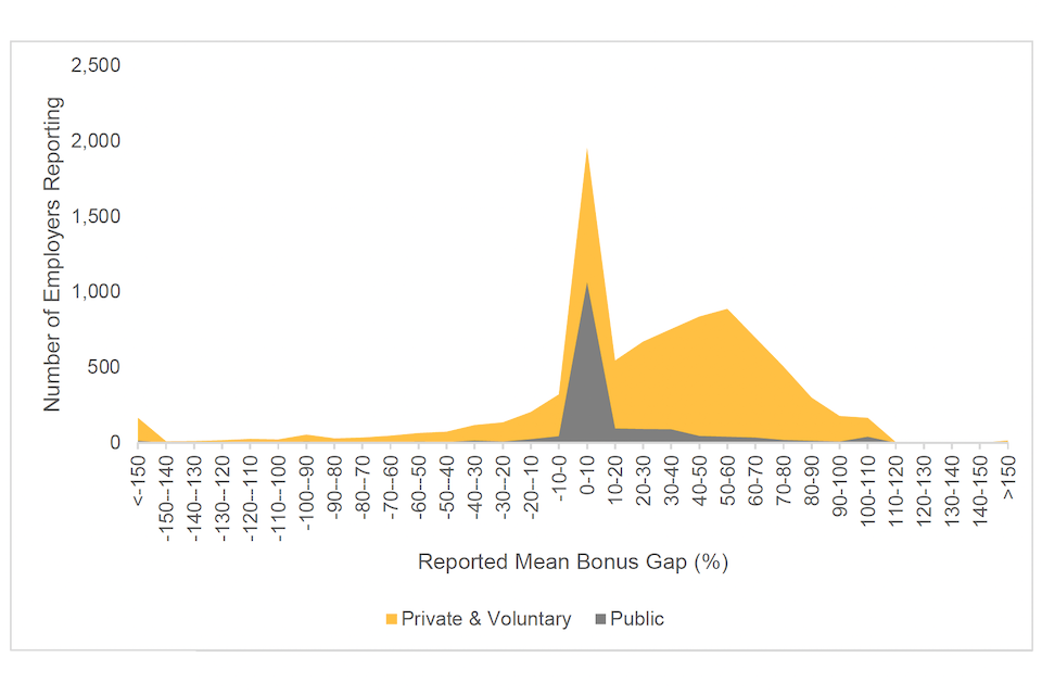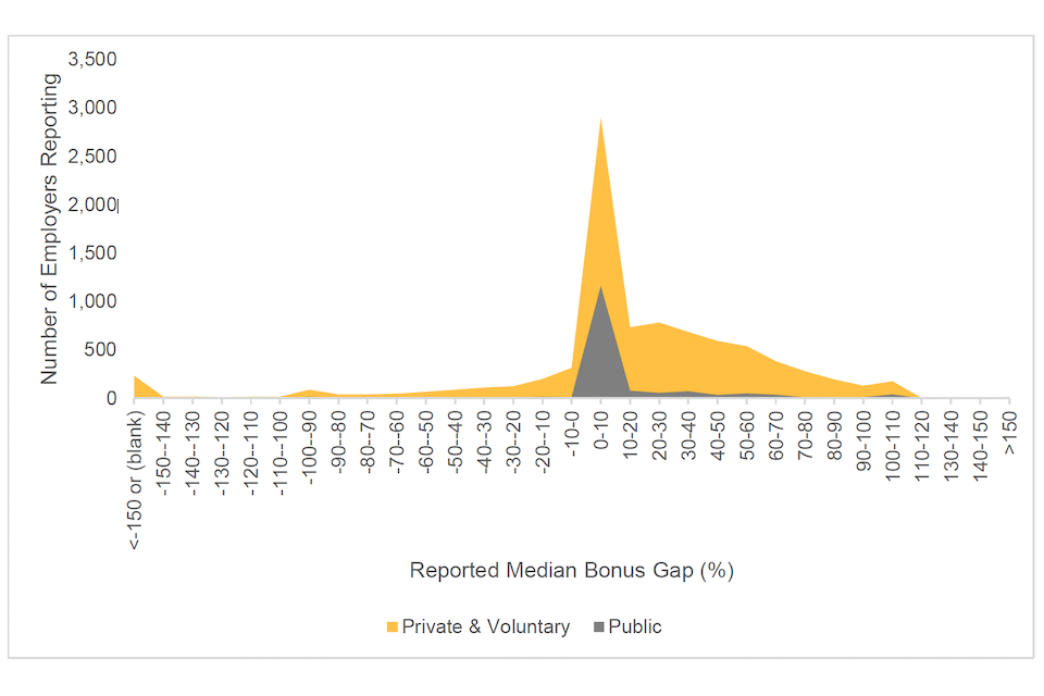 53% of reported median bonus gaps were positive, 15% were negative, and 33% of employers reported a median bonus gap of 0%.