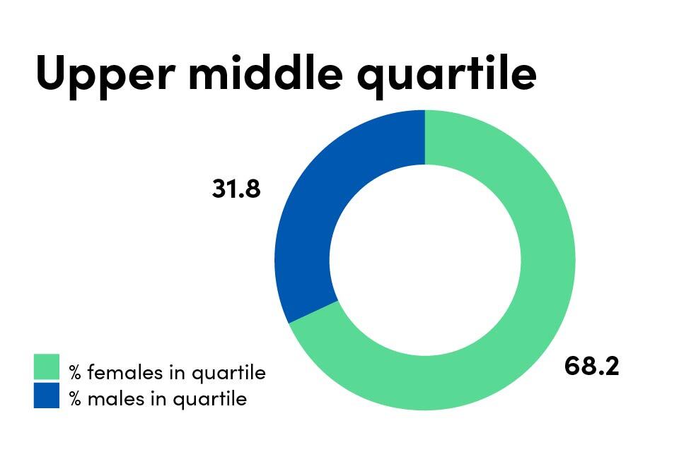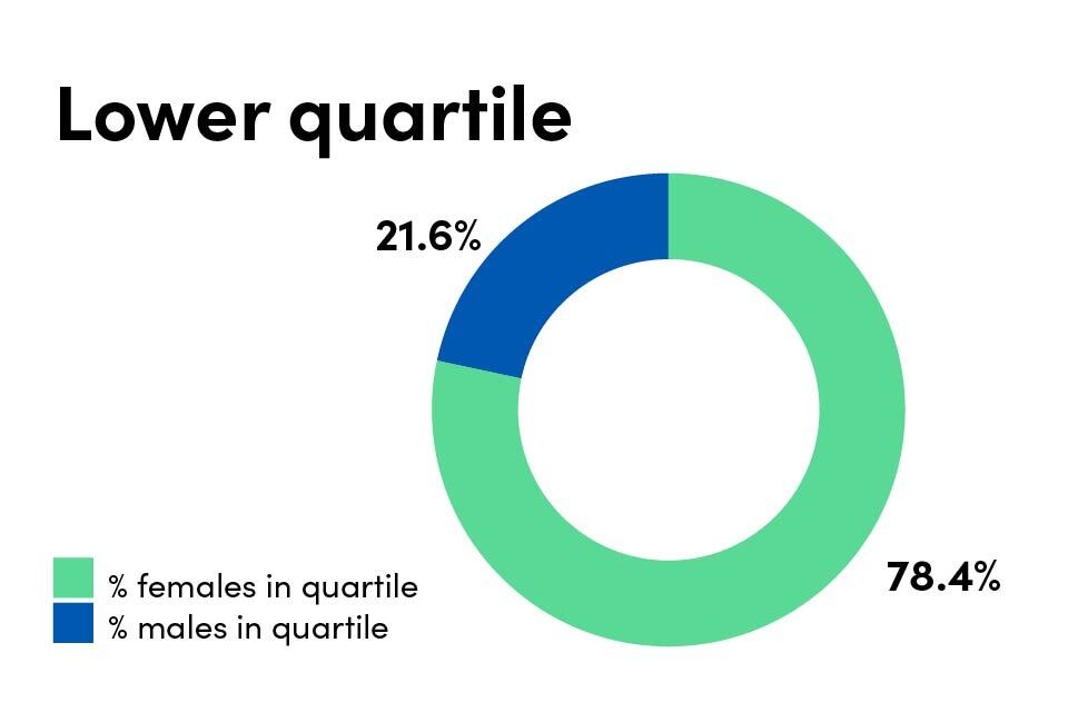 While women are represented across all quartiles, 78.4% of the lower paid quartile are women, which is a 5.5% increase on the previous year. In contrast 49.4% of those in the upper quartile are women which is a decrease of 2.98%. Both the increase at the lower end of the quartiles and the decrease at the upper end have contributed to the overall gender pay gap increase for 2024.