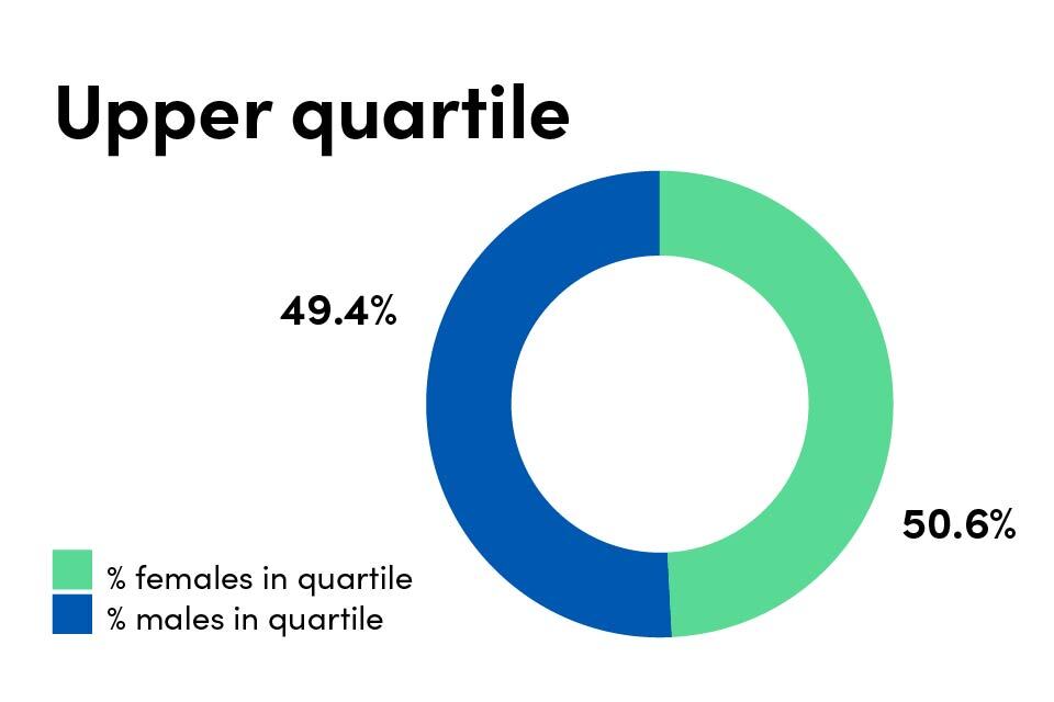 Pie chart showing Ofqual’s upper pay quartile broken down by male and female employees. 50.6% in the upper quartile are female and 49.4% are male.