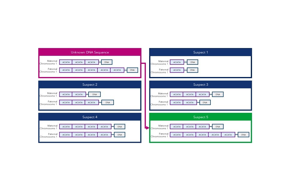 DNA fingerprinting counts the number of repeated sequences in pre-determined short tandem repeat (STR) areas of the genome to differentiate between individuals, rather than matching the sequences directly. This allows suspects to be matched to samples taken from crime scenes. The forensic DNA profile used by police in England and Wales, DNA-17, uses 16 different STR areas (or loci) for comparison. This means that the probability of two full DNA profiles from unrelated individuals matching by chance is around one in a billion.