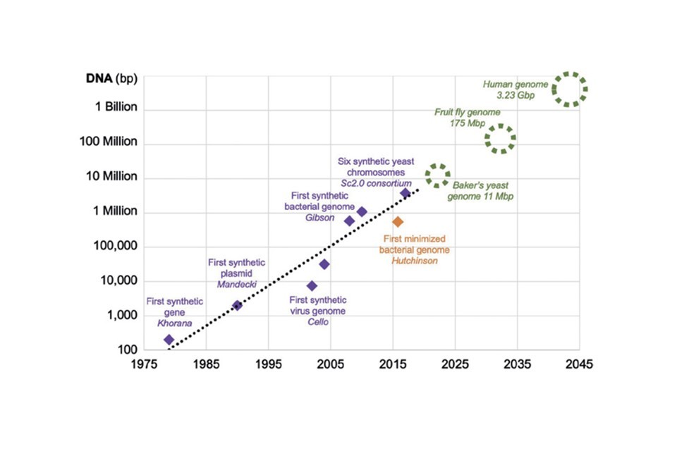 Prediction for when we’ll be able to build a full replica human genome synthetically (based on current progress).