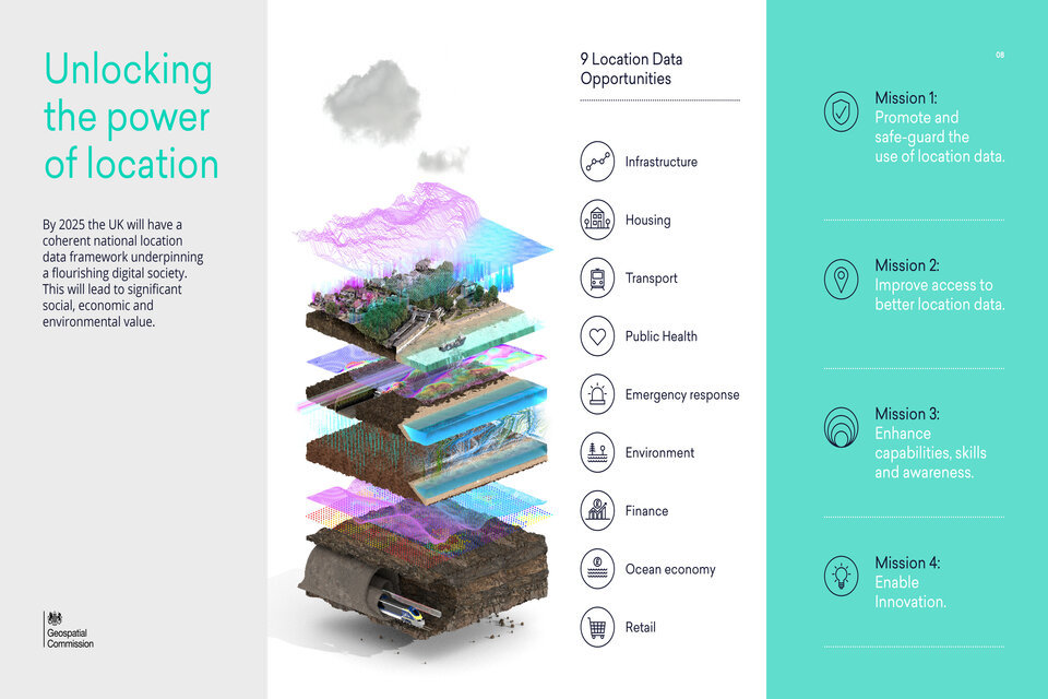 The Geospatial Commission has been charged with delivering a transformative vision to unlock the power of location. Our work to date has identified nine location data opportunities[footnote 3], and has been developed in partnership with the key UK public sector geospatial organisations, the ‘Partner Bodies’[footnote 4], and other parts of the public and private sectors. Together we have identified challenges that have resulted in a complex and fractured geospatial policy landscape. The UK Geospatial Strategy outlines four missions to tackle these challenges and maximise the opportunities: