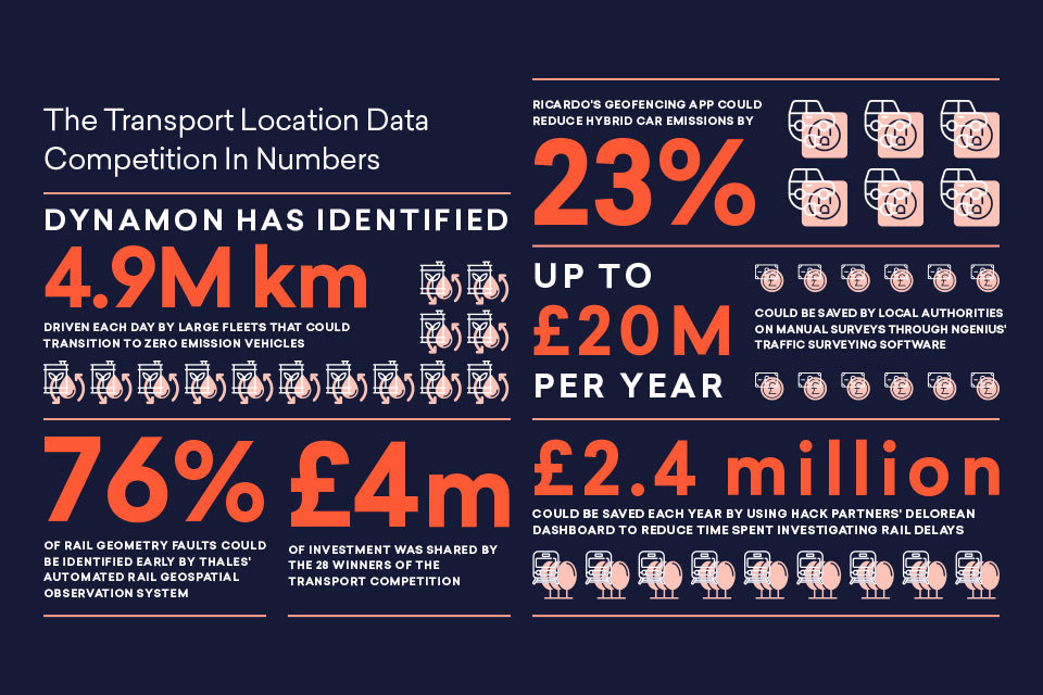 We established a Transport Location Data Competition with Innovate UK in 2020 to bring together public sector transport data challenges with commercial innovators and deliver novel solutions. The competition targeted major transport challenges, including overcoming transport network siloes, increasing efficiency, mitigating active travel safety risks and tackling logistic challenges in the supply chain.
