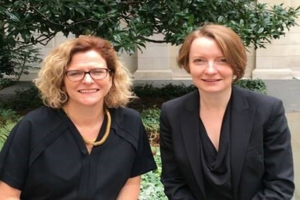 The Joint-Heads of the GES Clare Lombardelli and Sam Beckett seated outdoors