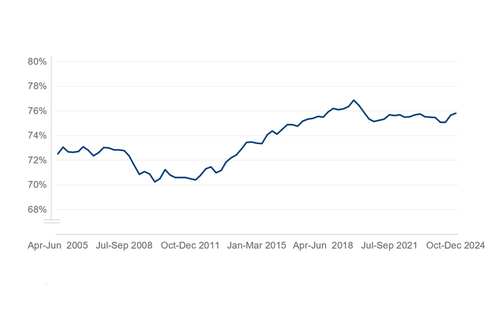 The employment rate of people aged 18 to 66 is 75.8%. This is 0.3% pts up on the year and 1.1% pts down on pre-COVID pandemic.