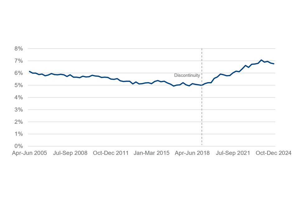 Economic inactivity due to long-term sickness has been trending upwards among people aged 18 to 66 since 2019[footnote 14]. It is currently at 6.8%, 1.6% pts above pre-covid (5.2%).