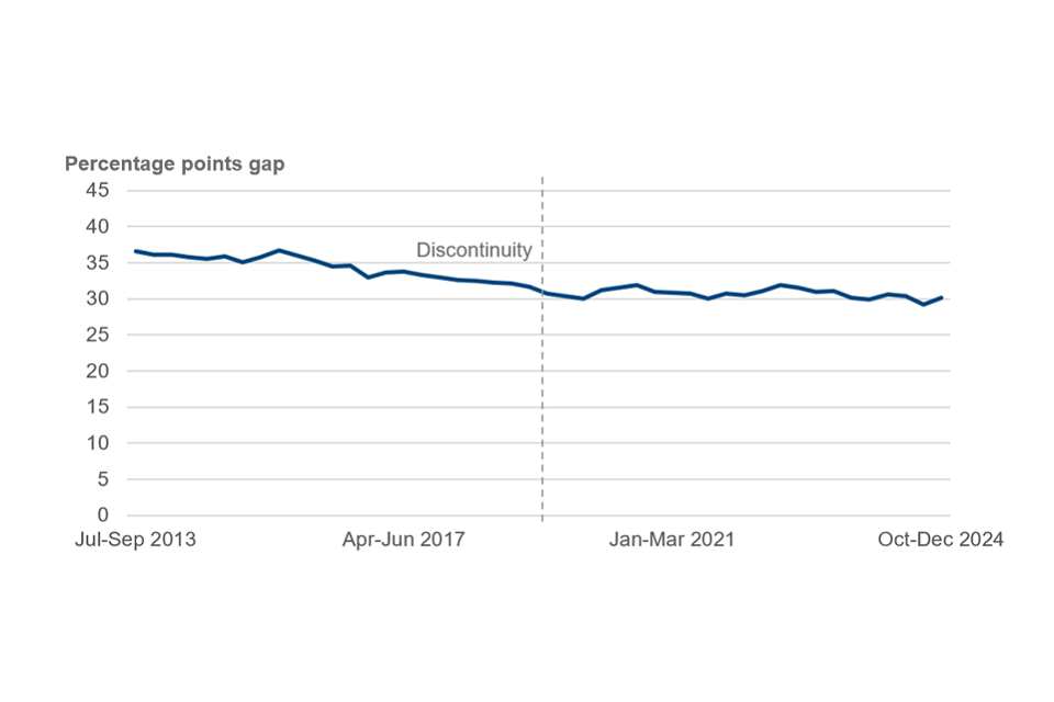 The gap between the employment rates of disabled and non-disabled people, aged 18 to 66, has generally been reducing over time[footnote 15]. It is currently at 30.1% pts, near historic low of 30.0% pts.