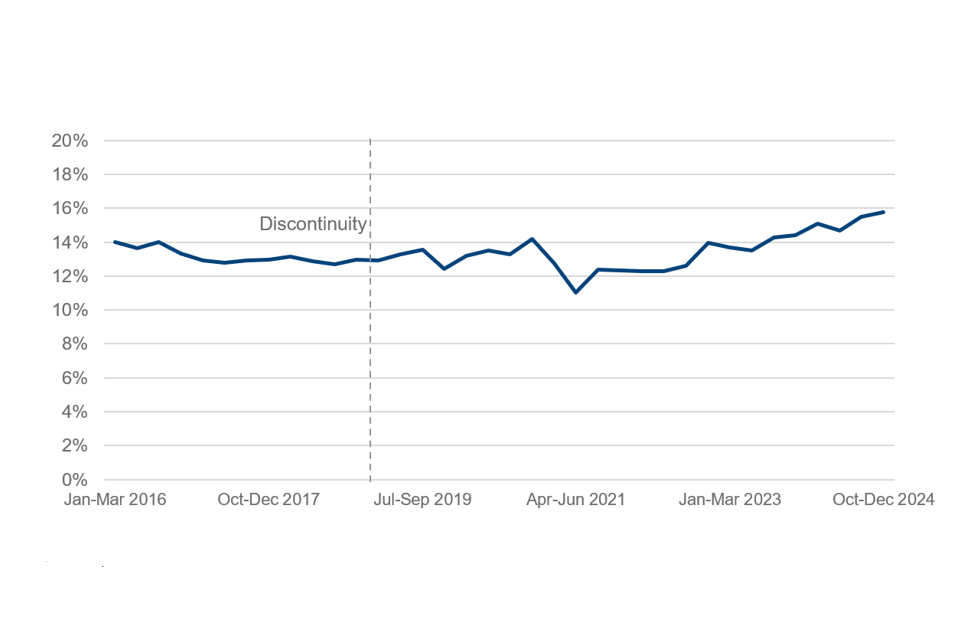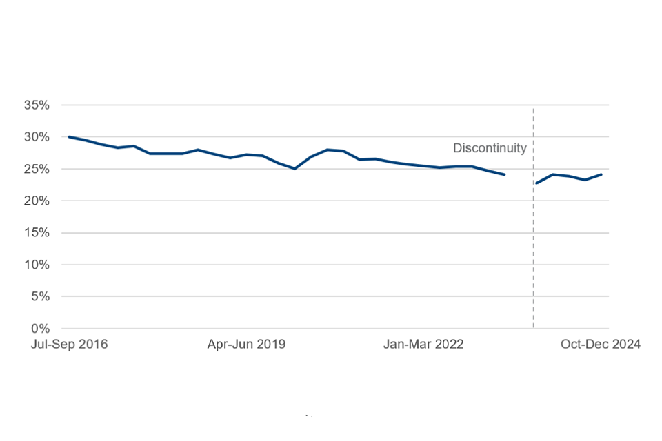 Data from October to December 2023 onward has been ‘reweighted’ by the ONS to reflect newer population estimates, causing a step change discontinuity in estimates before and after this period. Estimates for July to September 2023 are unavailable due to quality concerns. ↩