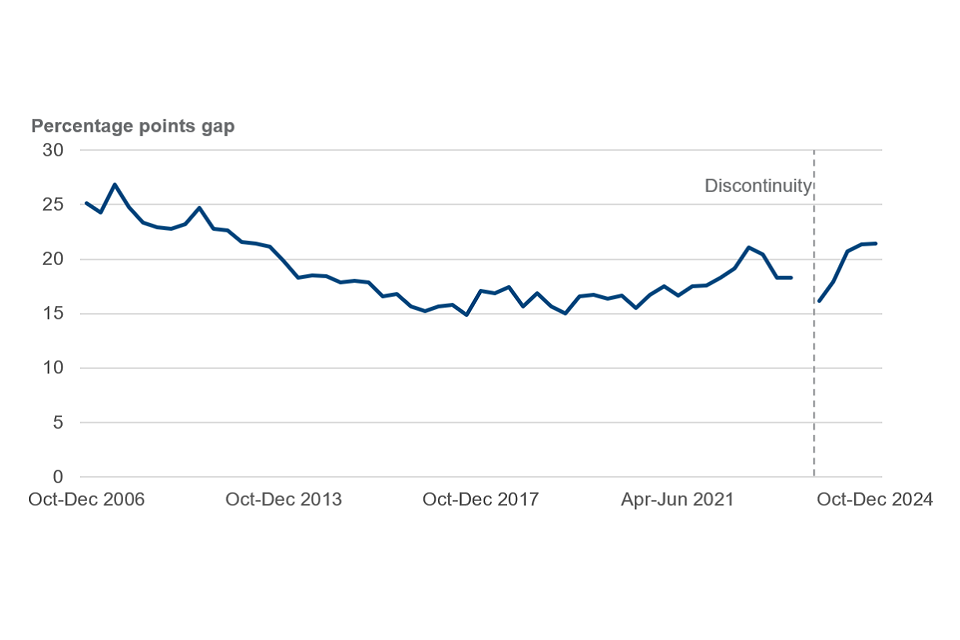 3. Disability employment rate gap – the difference in the employment rate of people, aged 18 to 66, who report they are disabled as defined by the Government Statistical Service (GSS) Harmoniseed Standard[footnote 6], and those who do not.