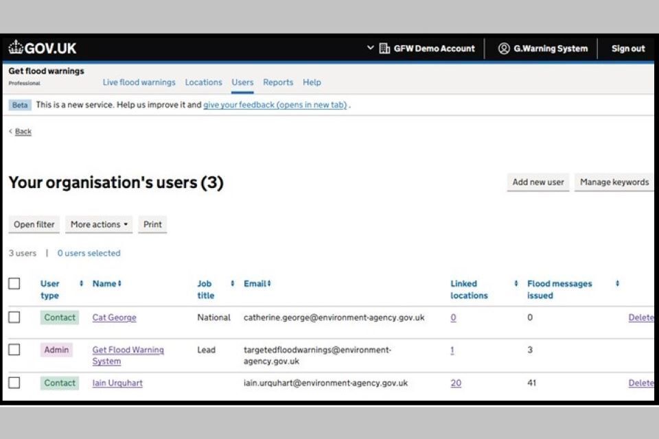 Administrators for an organisation can add locations of interest and then link contacts to these. This allows organisations to tailor which flood alerts and flood warnings each of their contacts receive.