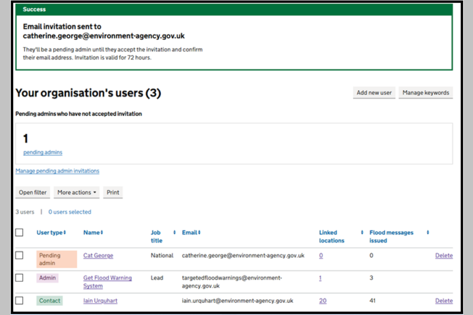 Image 7: Success message showing email invitation sent and user type as ‘pending admin’. Image courtesy of the Environment Agency.