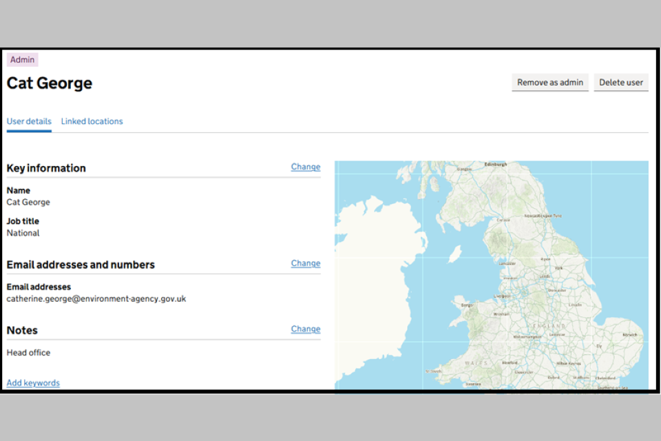Image 8: User profile page for admin user with ‘Remove as admin’ option. Image courtesy of the Environment Agency.