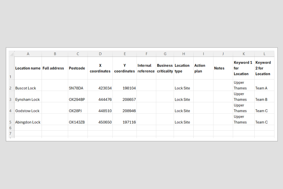 Step 3: Fill in the location name, address and postcode, and or X and Y coordinates. Do not change the column names, order or structure.
